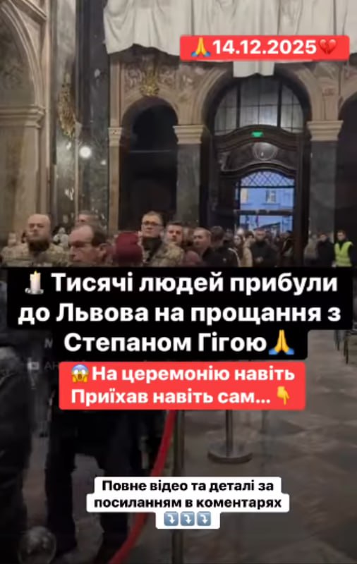Церемонія розпочалася 14 грудня о 16:00 і триватиме до 23:00. Біля труни — море квітів, вінків, поруч рідні: син Степан, донька Квітослава, дружина, онуки. Серед присутніх — колеги, шанувальники з різних міст, військові, молодь. О 19:00 відбувся чин парастасу, а вже завтра, 15 грудня, о 14:00 у цьому ж храмі розпочнеться чин похорону. О 15:00 на площі Ринок відбудеться загальноміське прощання, після чого Степана Гігу поховають на 75-му полі Личаківського кладовища — такою була його воля.