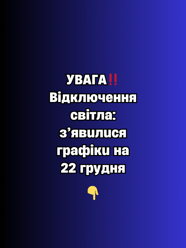 22 грудня більшість регіонів України знову перейдуть на погодинні відключення світла — енергетики попереджають: графіки можуть змінюватися протягом дня, а причина — наслідки нових російських атак по енергетичній інфраструктурі.