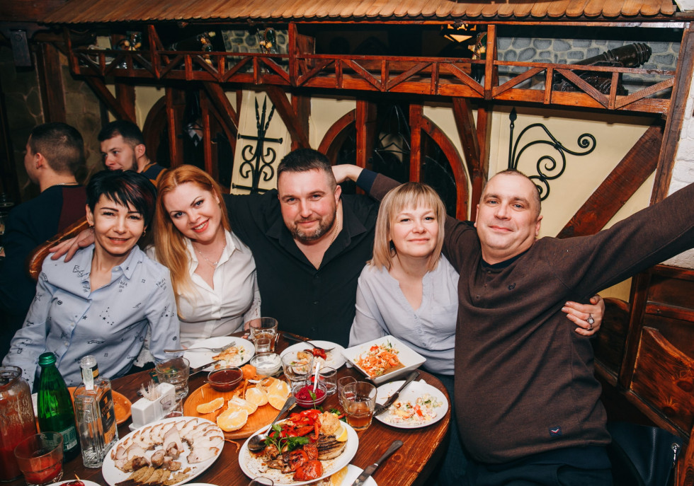 Ось ми всі зустрілися та сіли за стіл. Офіціанти принесли нам салатики та… багато випивки.